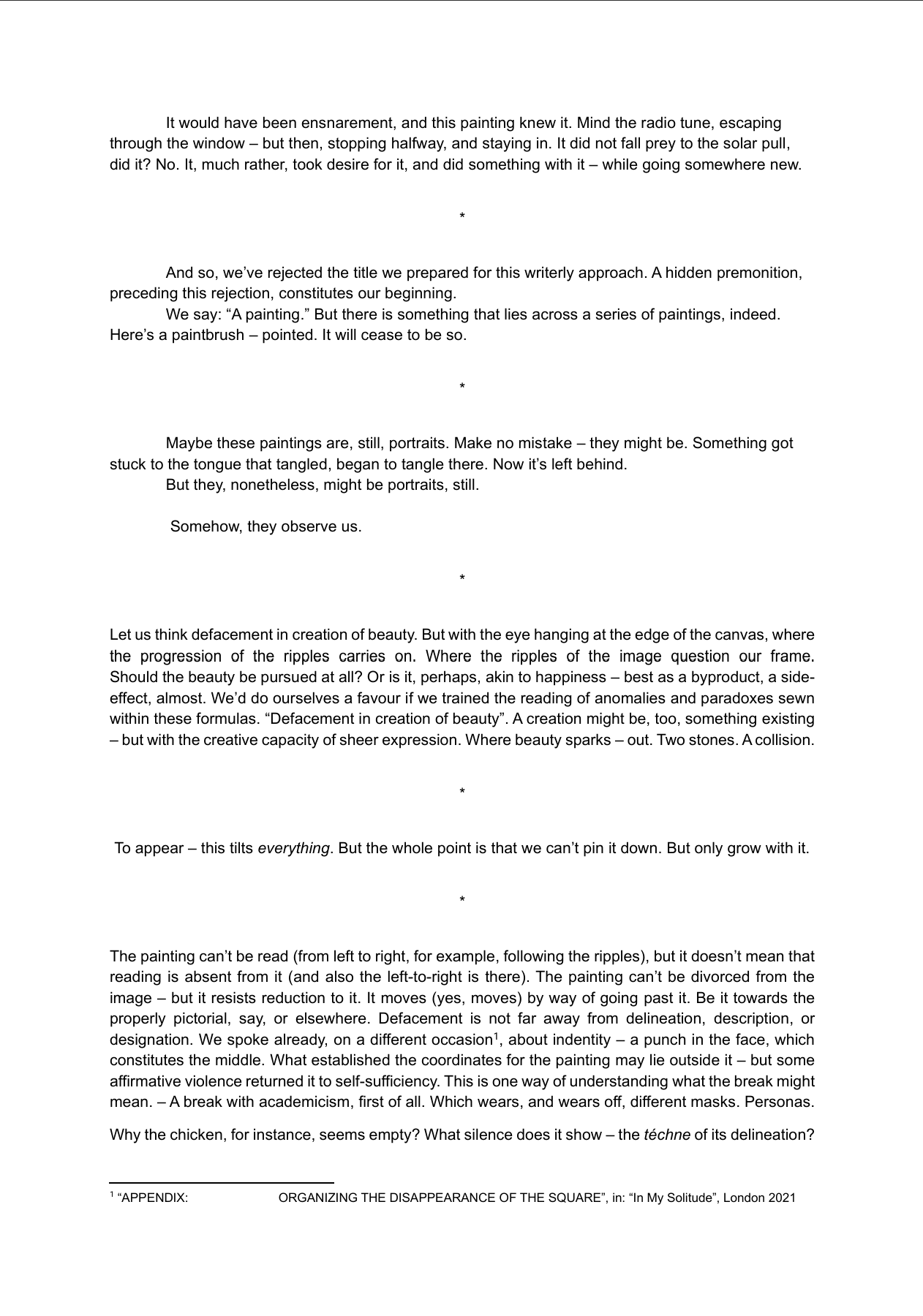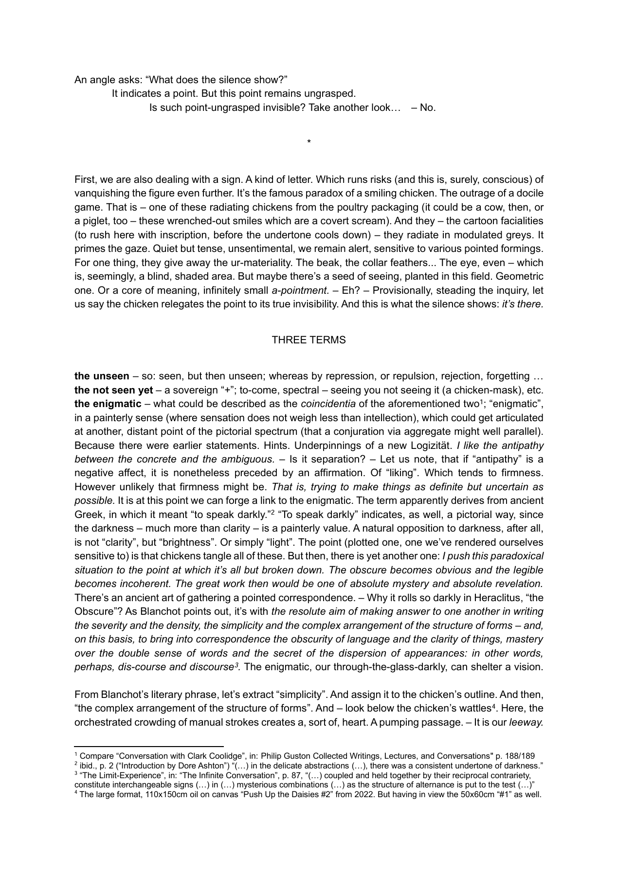 Among their joint works, One Could Say frames a textual–image diptych on the genesis of perception, where cosmological afterglow and radiating matter meet in painting’s resistance to legibility. It Would Have Been Falling-Prey reads Hazell’s painted surfaces as a para-poetic manifesto on defacement, spectral figuration, and refusal. Hazell’s solo exhibition Auf Wiedersehen (P145, Berlin, 2022) — with works such as Throw the Towel and Push the Daisies — staged euphemisms for death and resistance in a painterly language of humor, muted violence, and emotional distortion.