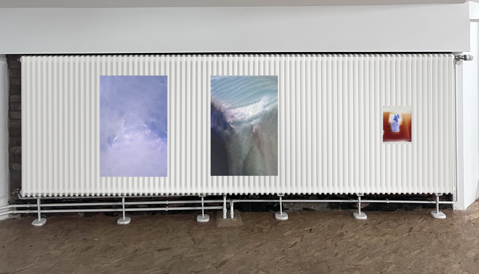 In collaboration with artist Moritz Haase, Distinct Inside staged a para-curatorial and poetic intervention titled Theses on the Radiator, presented at KW Institute for Contemporary Art as part of the UdK × KW project Napping in Density. Haase’s thermographic images — heat-sensitive photographs printed on thermochromic paper — were mounted directly onto a functioning radiator. The images shift subtly when touched, breathing and transforming through proximity, evoking a gestational temporality of slow transformation and held duration.